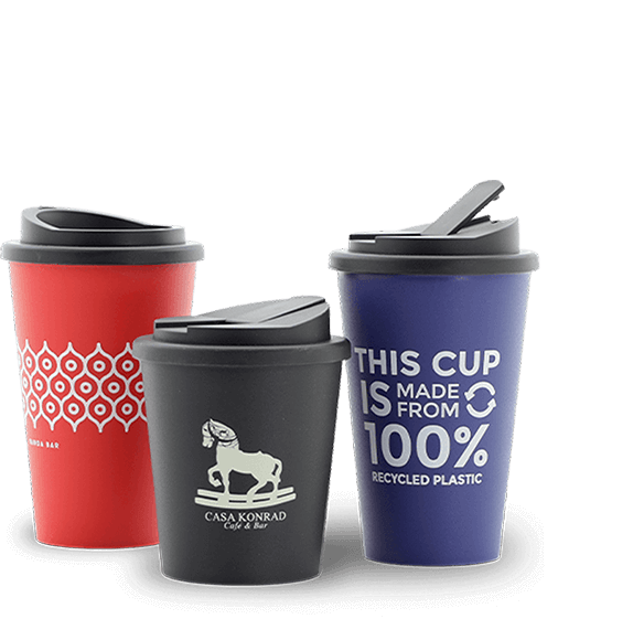 Hochwertige Mehrweg Coffee To Go Becher - Schon ab 50 Stück perfekt mit Logo und Motiv zu bedrucken. Spülmaschinenfest und auch aus Recyclingmaterial oder Bio Kunststoff. Zum Beispiel: Green Coffee Shop Thermobecher aus 100% Recycling Kunststoff