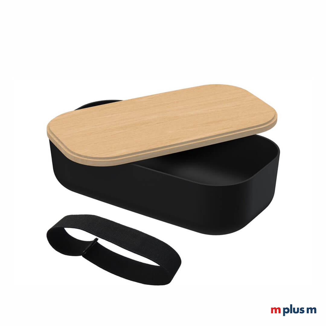 Nachhaltige Lunchbox lebensmittelechtem Kunststoff mit einem Deckel aus Buchenholz. Made in Germany und mit Logodruck ein schöner Werbeartikel.