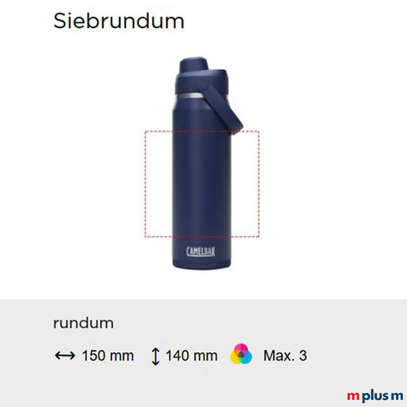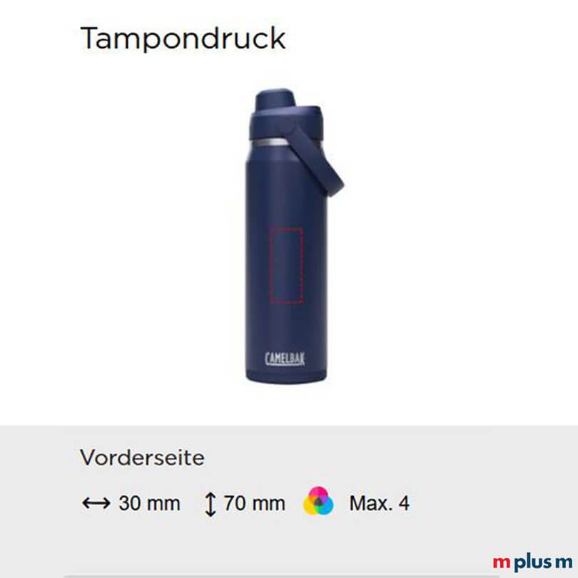 Ab einer Bestellmenge von 25 Stück können Sie die neue Camelbak ISO Thrive Chug Thermosflasche mit Ihrem Logo bedrucken lassen. Sehr schön als Geschenk für Kunden oder Mitarbeiter, als Merch oder Prämie. Folgende Druckmöglichkeiten bestehen: