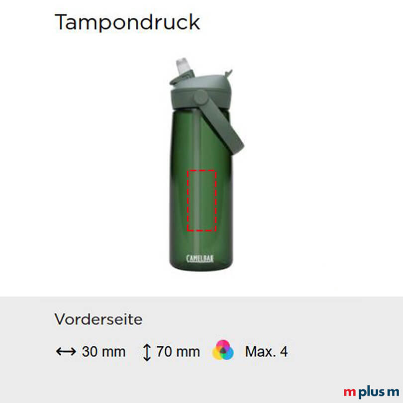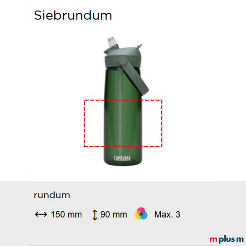Ab einer Bestellmenge von 25 Stück können Sie die neue Camelbak Thrive Flip Straw Trinkflasche mit Ihrem Logo bedrucken lassen. Sehr schön als Geschenk für Kunden oder Mitarbeiter, als Merch oder Prämie. Folgende Druckmöglichkeiten bestehen: