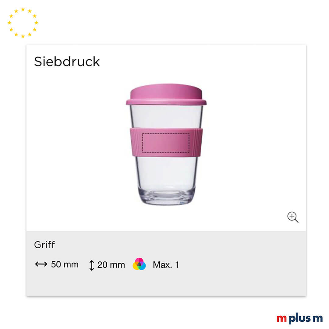 Ab einer Menge von 50 Stück können Sie den spülmaschinengeeigneten 'Cristallino' Kaffeebecher mit Ihrem Logo einfarbig bedrucken lassen.