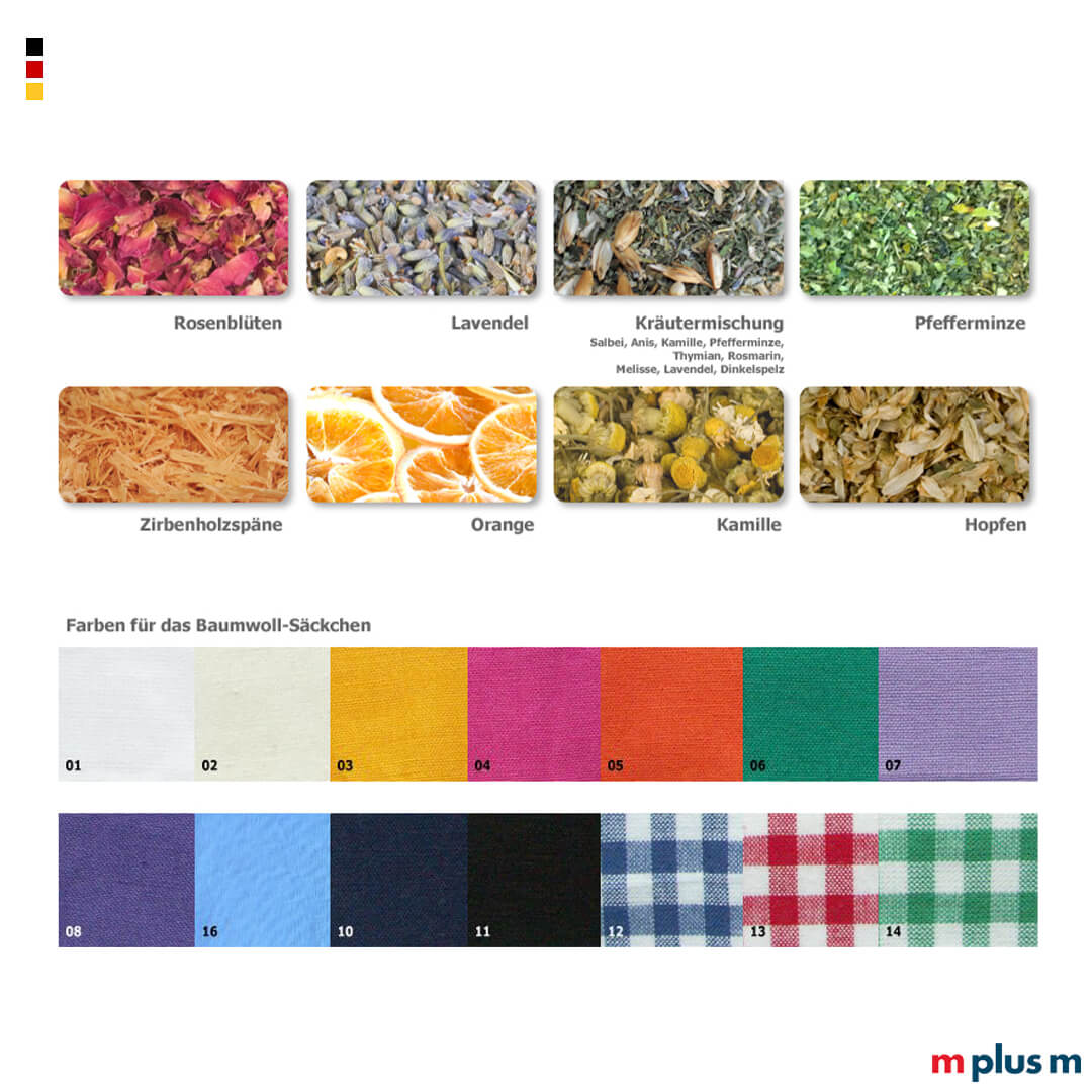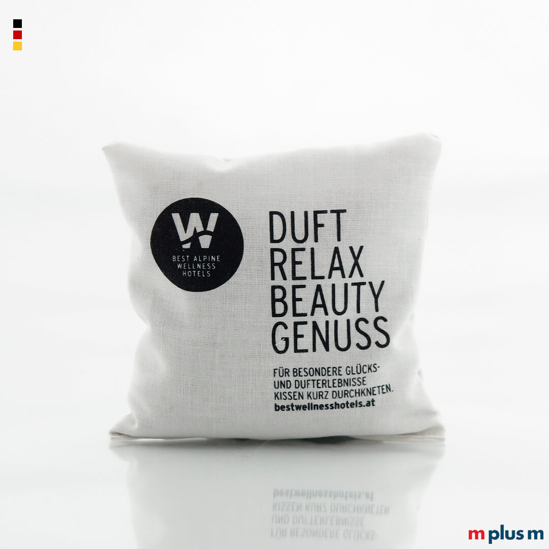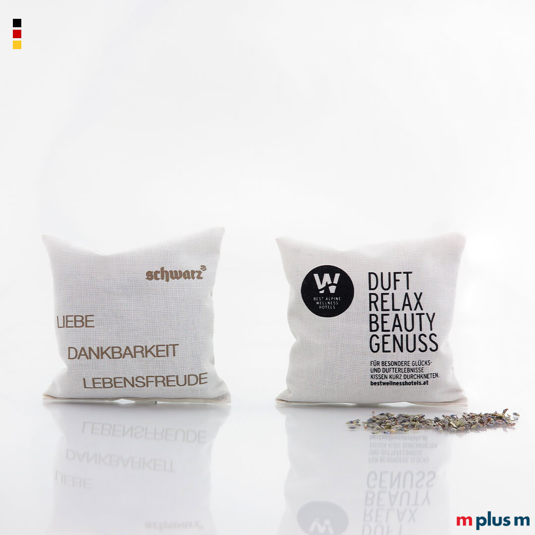Die kleinen Duftsäckchen aus Baumwolle werden in Deutschland genäht und ganz nach Ihren Wünschen mit echten Kräutern befüllt. Sie können Größe und Ausführung wählen. Das Säckchen kann als Werbeartikel oder Werbegeschenk nach Ihren Vorgaben ein- bis vielfarbig mit Ihrem Logo oder Motiv bedruckt werden.