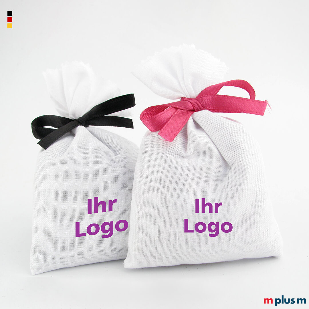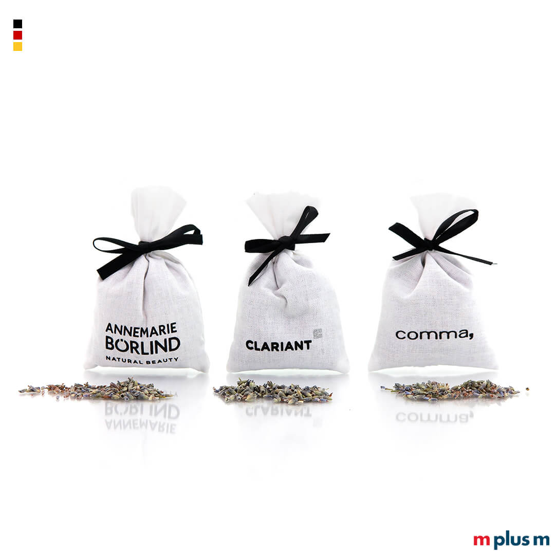 Die Duftsäckchen werden in Deutschland produziert und individuell befüllt. Sie lassen sich als nachhaltiger Werbeartikel vielfältig mit ein- oder mehrfarbigem Logo bedrucken.