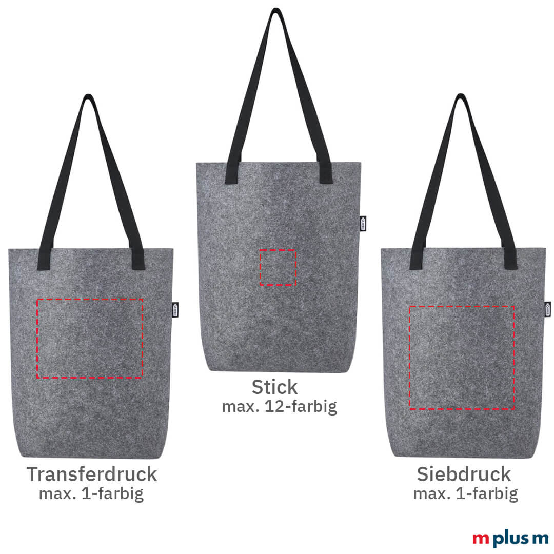 Ab einer Menge von 50 Stück können Sie die 'EcoFelt' Recycling Filztasche bedrucken lassen. Bedruckte Taschen mit Logo eignen sich ideal als Werbeartikel oder Werbegeschenk für Kunden und Mitarbeiter. Tragetaschen mit Logo können auch für das Employer Branding eingesetzt werden oder als Give Away Artikel verschenkt werden.