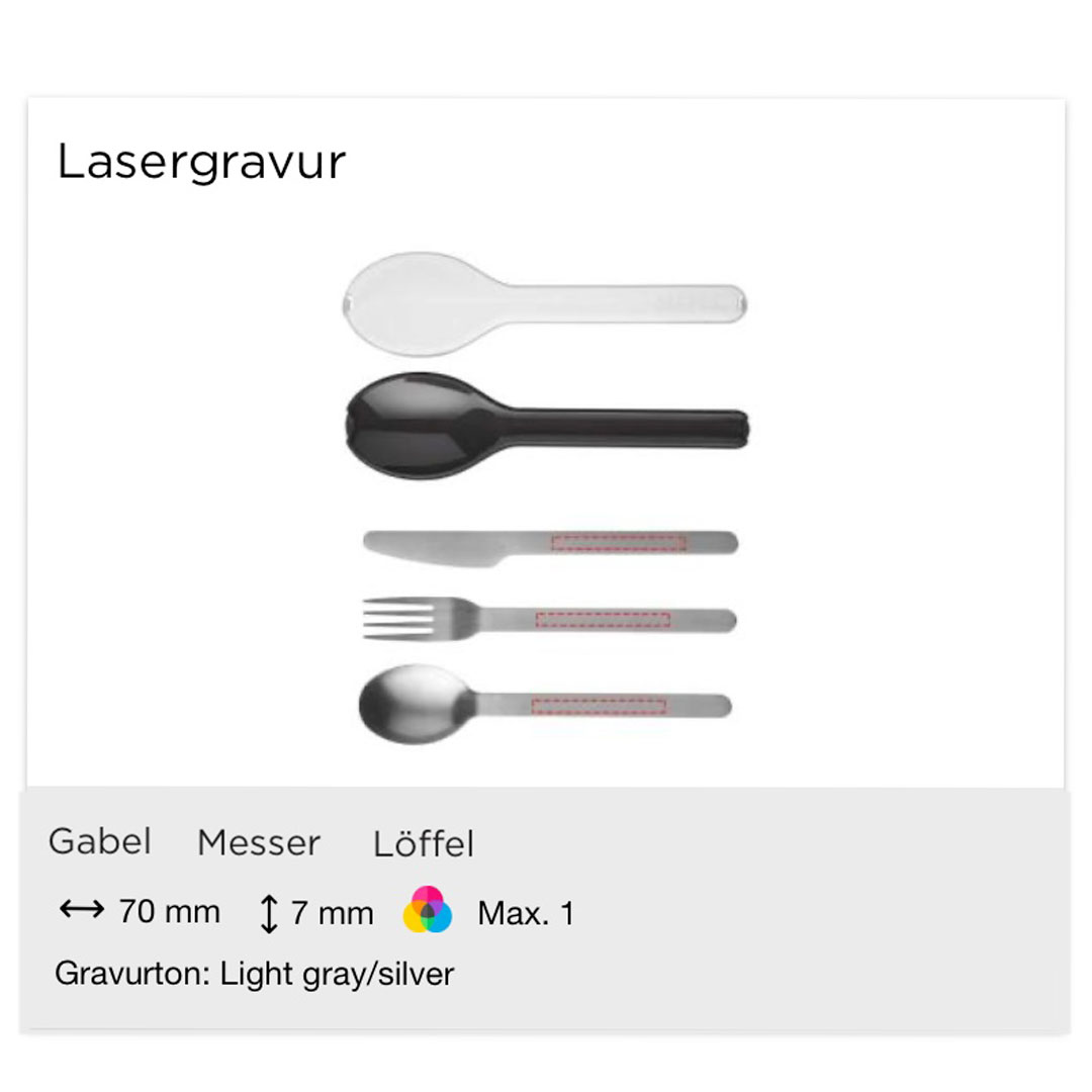 Das nachhaltige Mehrwegbesteck To Go 'Ellipse' von Mepal kann auf der Vorderseite der Aufbewahrungsbox mit Ihrem Logo bedruckt werden. Dadurch wird das Besteck zu Ihrem idealen nachhaltigen Werbeartikel. Das Set eignet sich ideal für Take Away.
