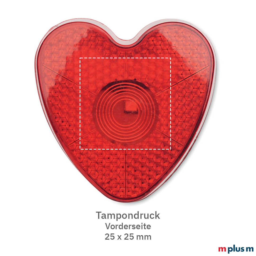 Kleiner schöner Werbeartikel für die Sicherheit. Herzförmiges rotes Reflektorlicht mit Clip auf der Rückseite zu einfachen Befestigung an Jacke oder Rucksack. Preiswertes Giveaway - als Werbeartikel ab 250 Stück mit Logo Druck.