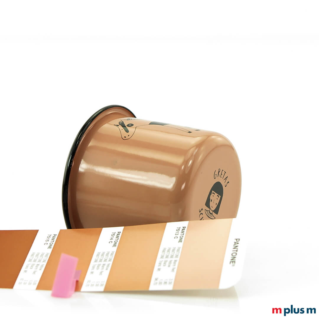 Die farbigen Emaille Tassen 'Helena' können wir ab 100 Stück in unserer europäischen Manufakturfertigung bedrucken. Ab 1.000 Stück können die Emaille Becher auch in der etwas stärker automatisierten Serienfertigung bedruckt werden.