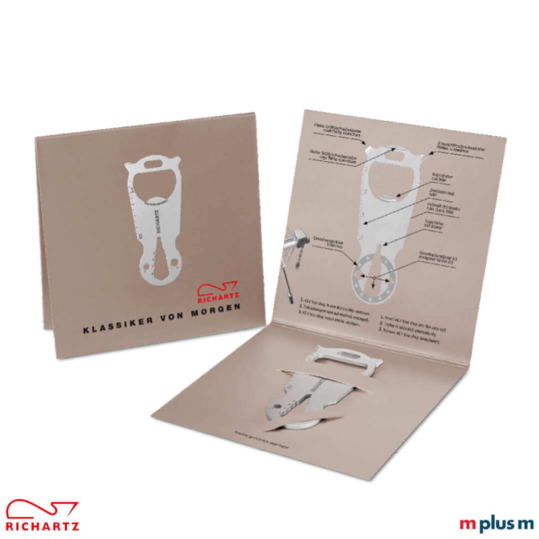 Hochwertiger Werbeartikel für ein Mailing, On-Packing oder ein Give-Away. Das Richartz 'Key Tool Shop' bietet mit seinen 14 Funktionen immer eine Lösung für alltägliche Dinge. Der Einkaufswagenlöser, die Nagelfeile, das Zentimetermaß und viele weitere Funktionen machen diesen Richartz Artikel so praktisch.