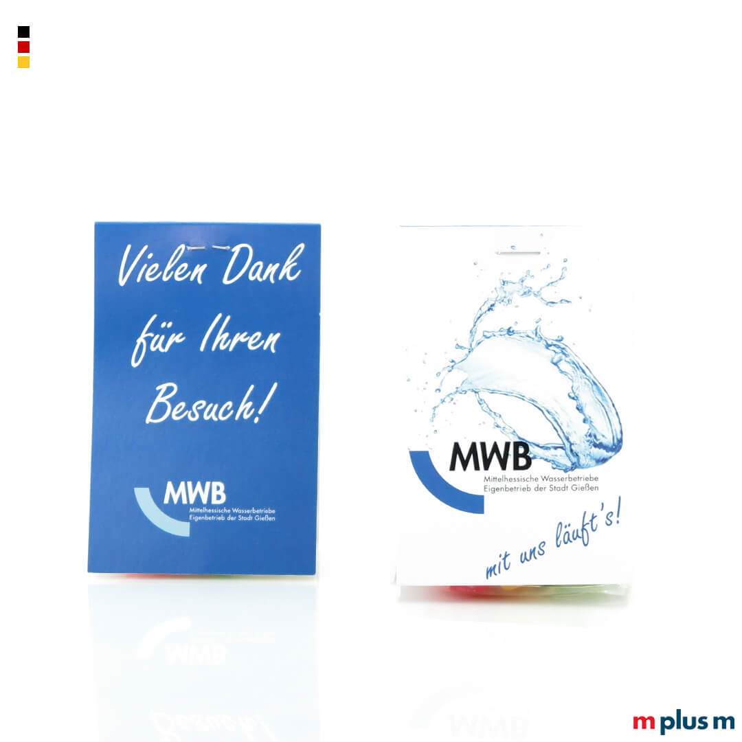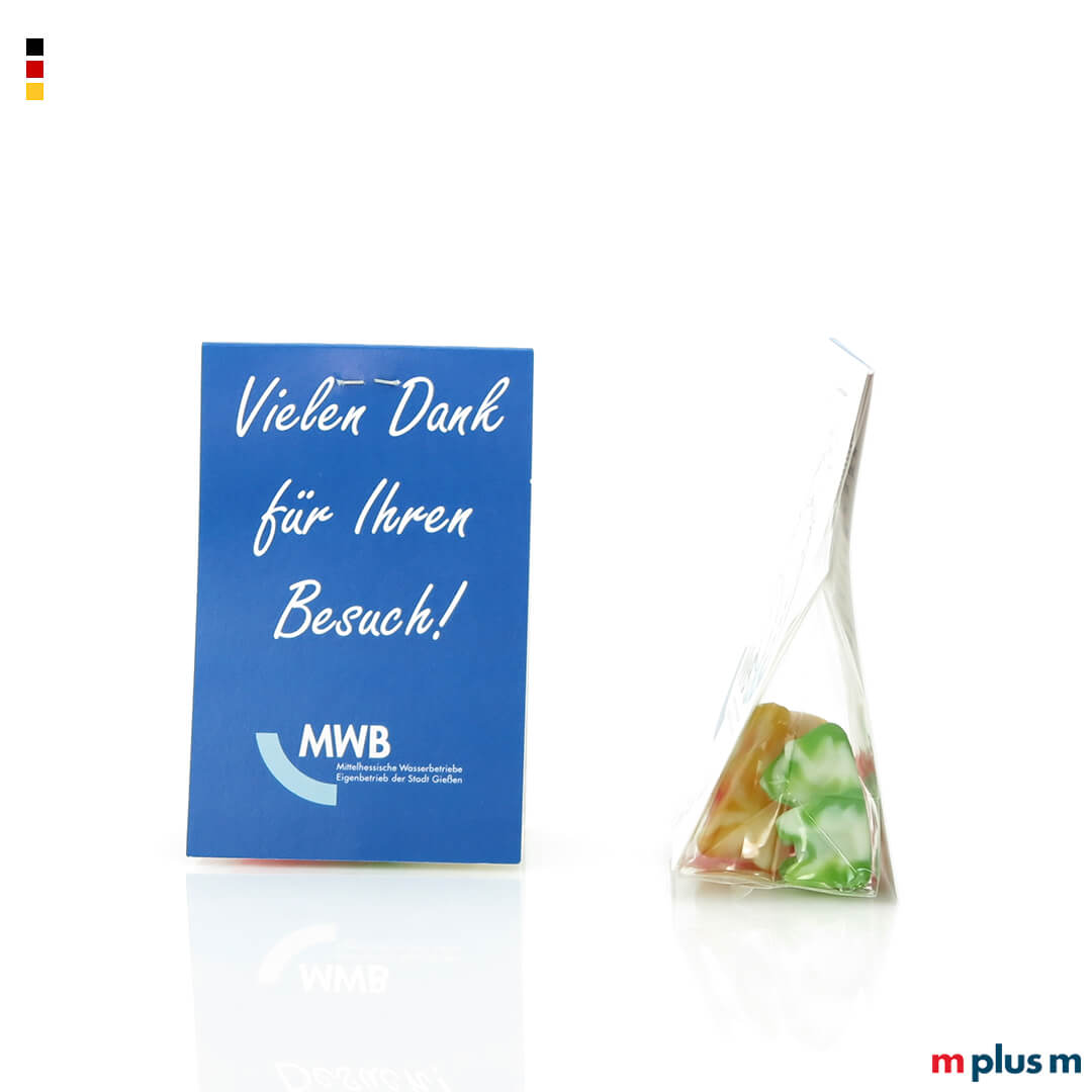Für die Naschtaschen gibt es eine große Auswahl an verschiedenen Süßigkeiten als Füllung. Über dem kleinen Beutel ist ein 'Dach' aus zwei Kartonflächen angebracht, das mit Ihrem Logo oder einer abtrennbaren Visitenkarte bedruckt werden kann.