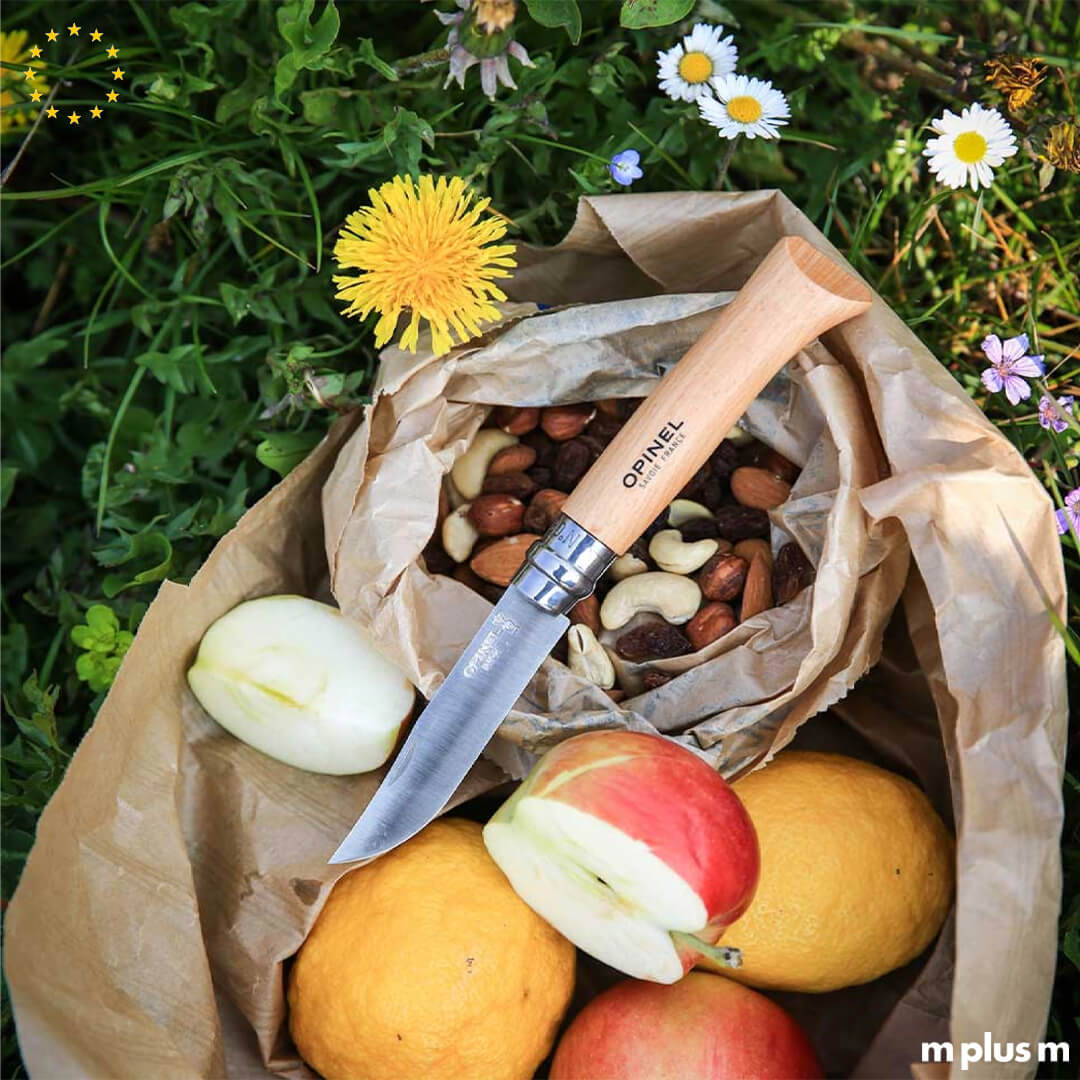 Das Opinel Taschenmesser Sandvik Stahl No 08 hat eine kräftige, rostfreie Sandvik Stahl Klinge und einen Griff aus Buchenholz. Mit der Virobloc-Klingenverriegelung ist dieses Messer für Picknick und Grillabende, aber auch zum Angeln oder für die Jagd ideal.