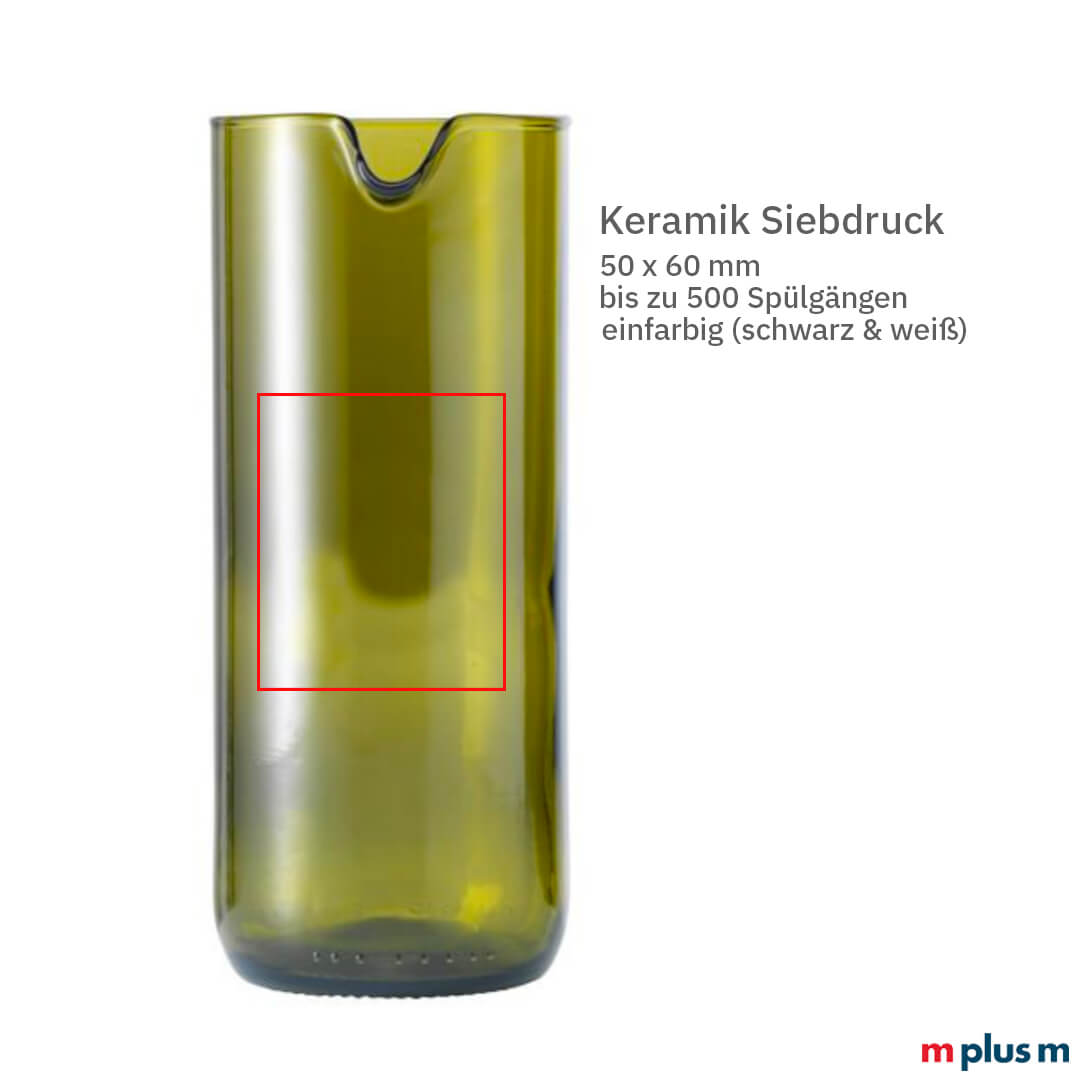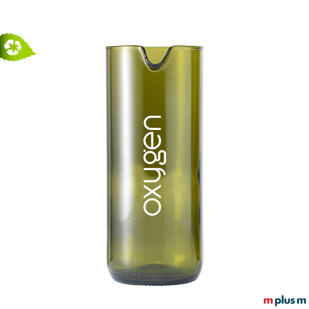 Die Glaskaraffe 'Carafe' hat ein Fassungsvermögen von 600 ml. Dass die Flasche aus einer Weinflasche upgecycelt wird, ist an ihrer Form sofort erkennbar. Die Karaffe ist leicht, wiederbefüllbar und passt unter den Wasserspender. Mit Ihrem Logo wird die Karaffe zu einem schönen Werbegeschenk oder Werbeartikel für Kunden und Mitarbeiter.