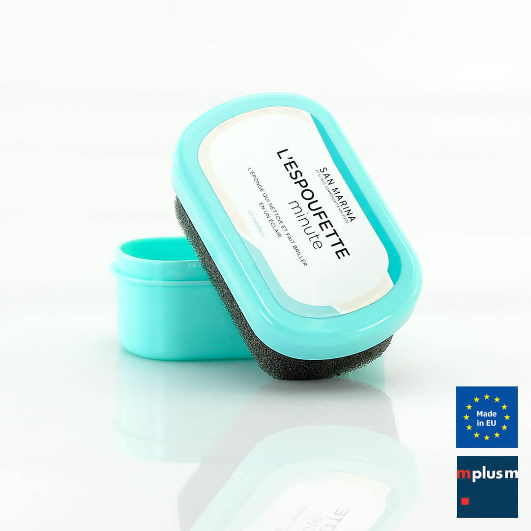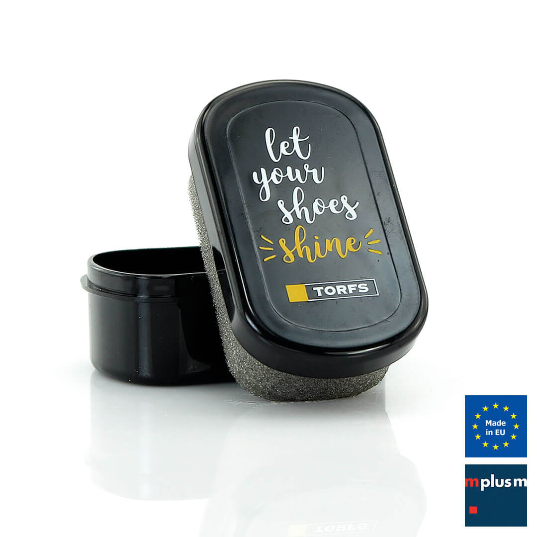 Schuhpflege Schwamm in eckiger Kunststoffdose. Der Schwamm wird in Europa produziert und kann ab 2.400 Stück mit Ihrem Logo bedruckt werden.