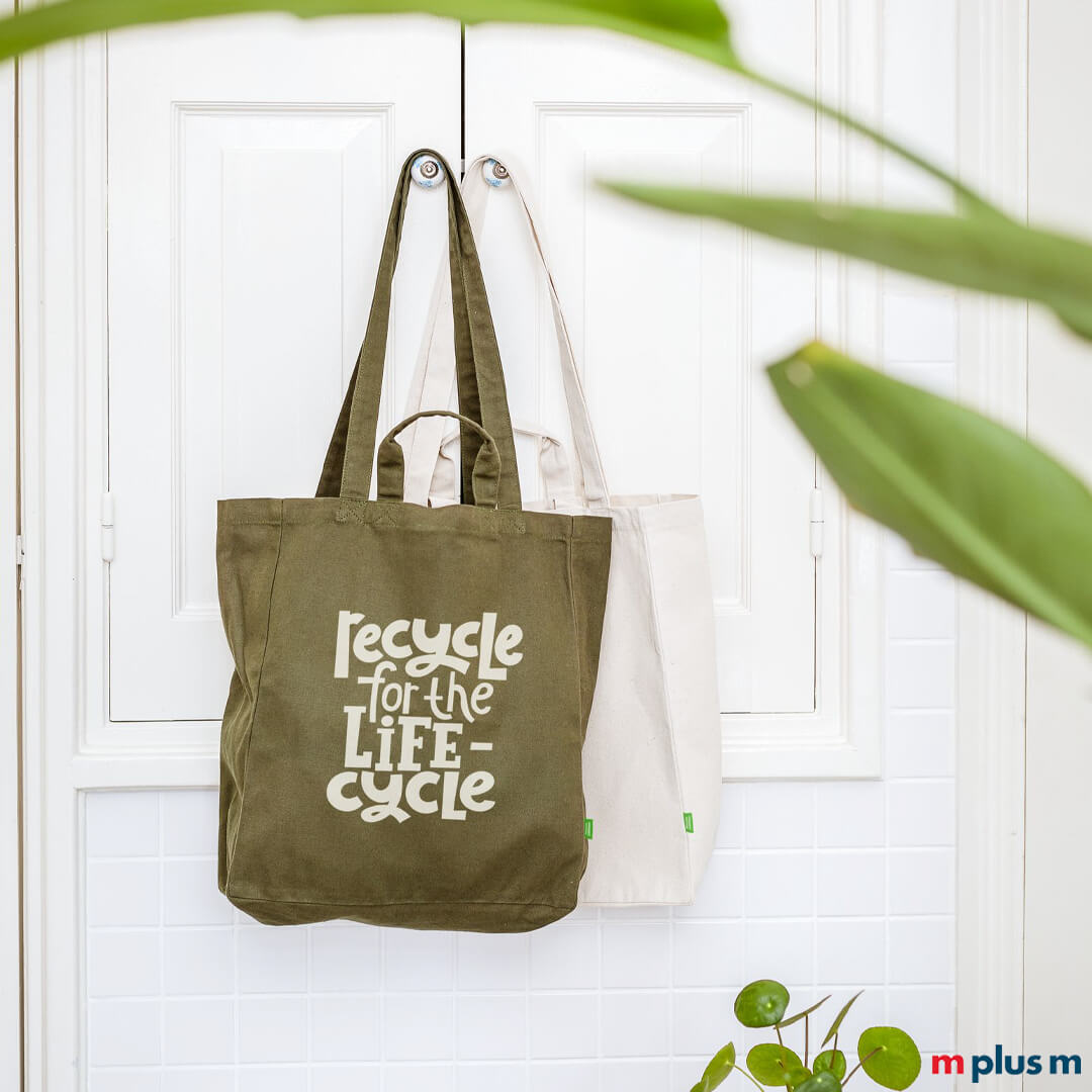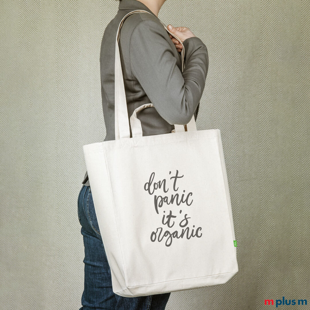 Mit Logodruck ist die nachhaltige Stofftasche aus Bio-Baumwolle ein idealer Werbeartikel für Kunden und Mitarbeiter oder ein geeigneter Merchandise Artikel.