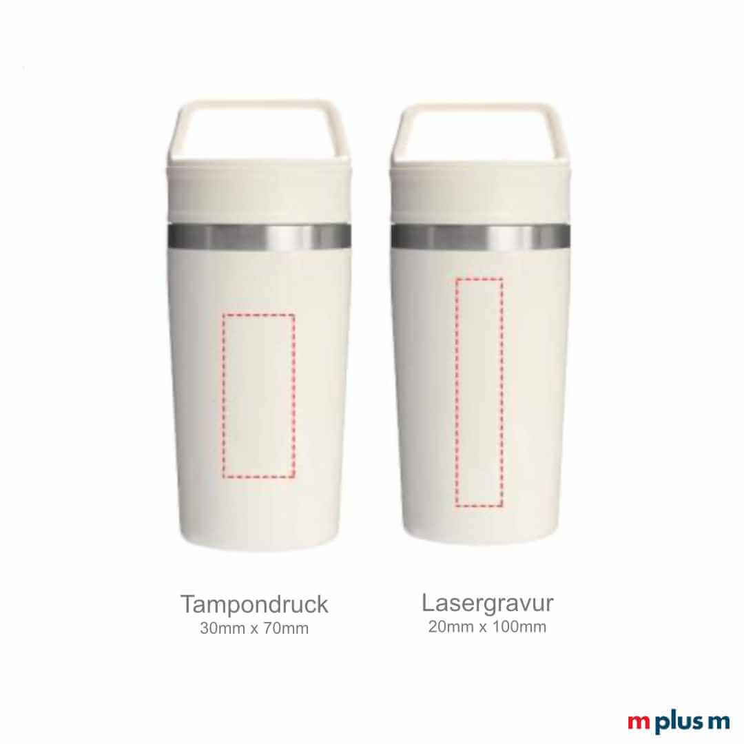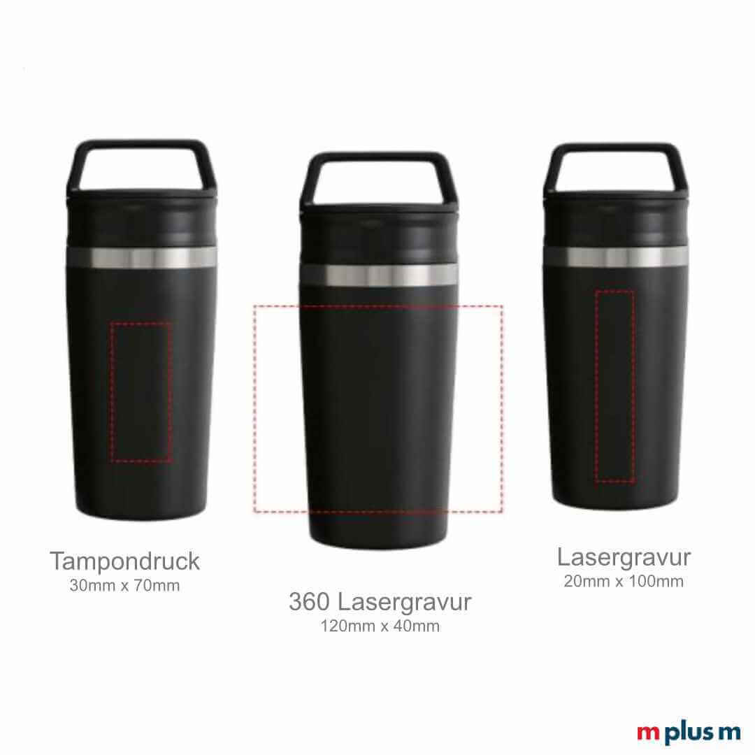 Ab 25 Stück können Sie den Café-To-Go Travel Mug von Stanley bedrucken oder gravieren lassen. Folgende Möglichkeiten für die Personalisierung gibt es: