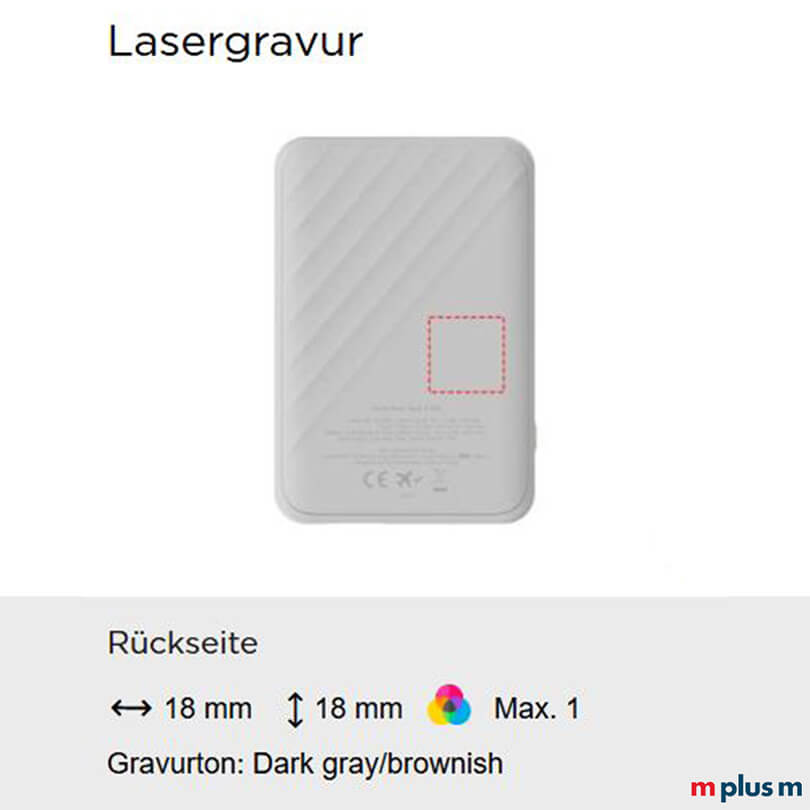 | Lasergravur | Rückseite | Einfarbig (Dunkelgrau/bräunlich) | 18 x 18 mm |