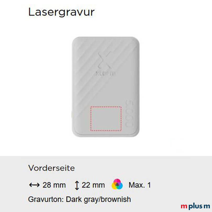 | Lasergravur | Vorderseite | Einfarbig (Dunkelgrau/bräunlich) | 28 x 22 mm |
