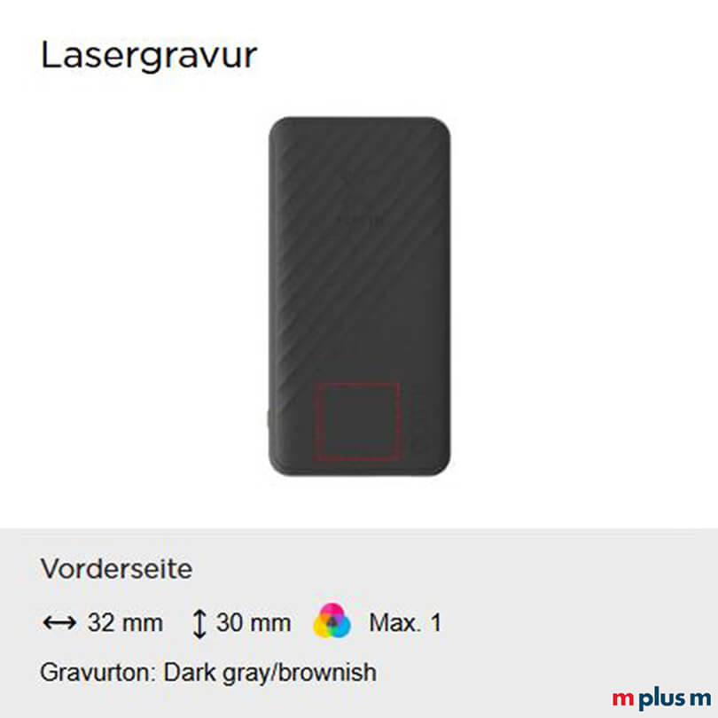 | Lasergravur | Vorderseite | Einfarbig (Dunkelgrau/bräunlich) | 32 x 30 mm |