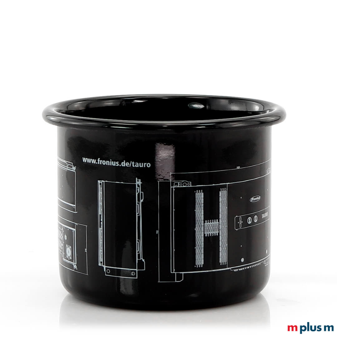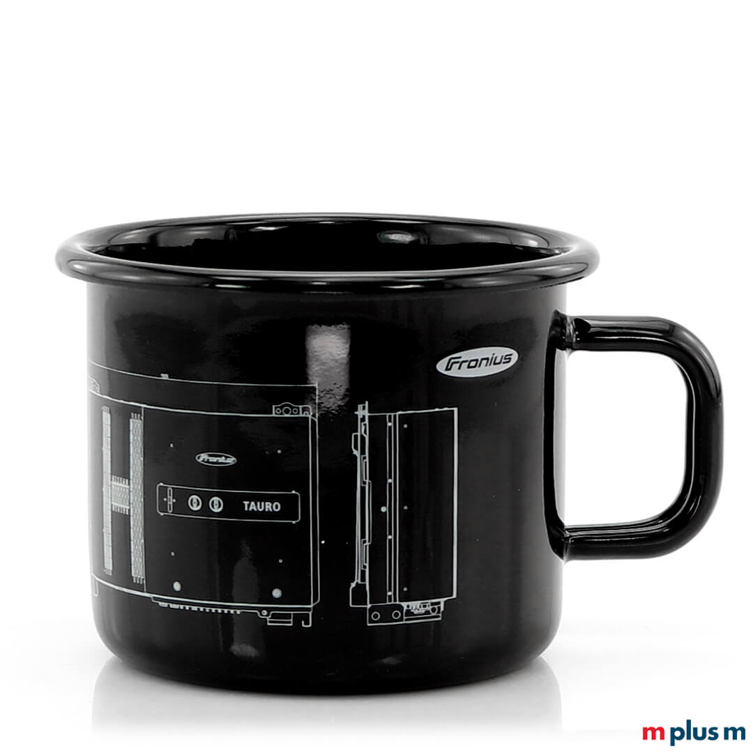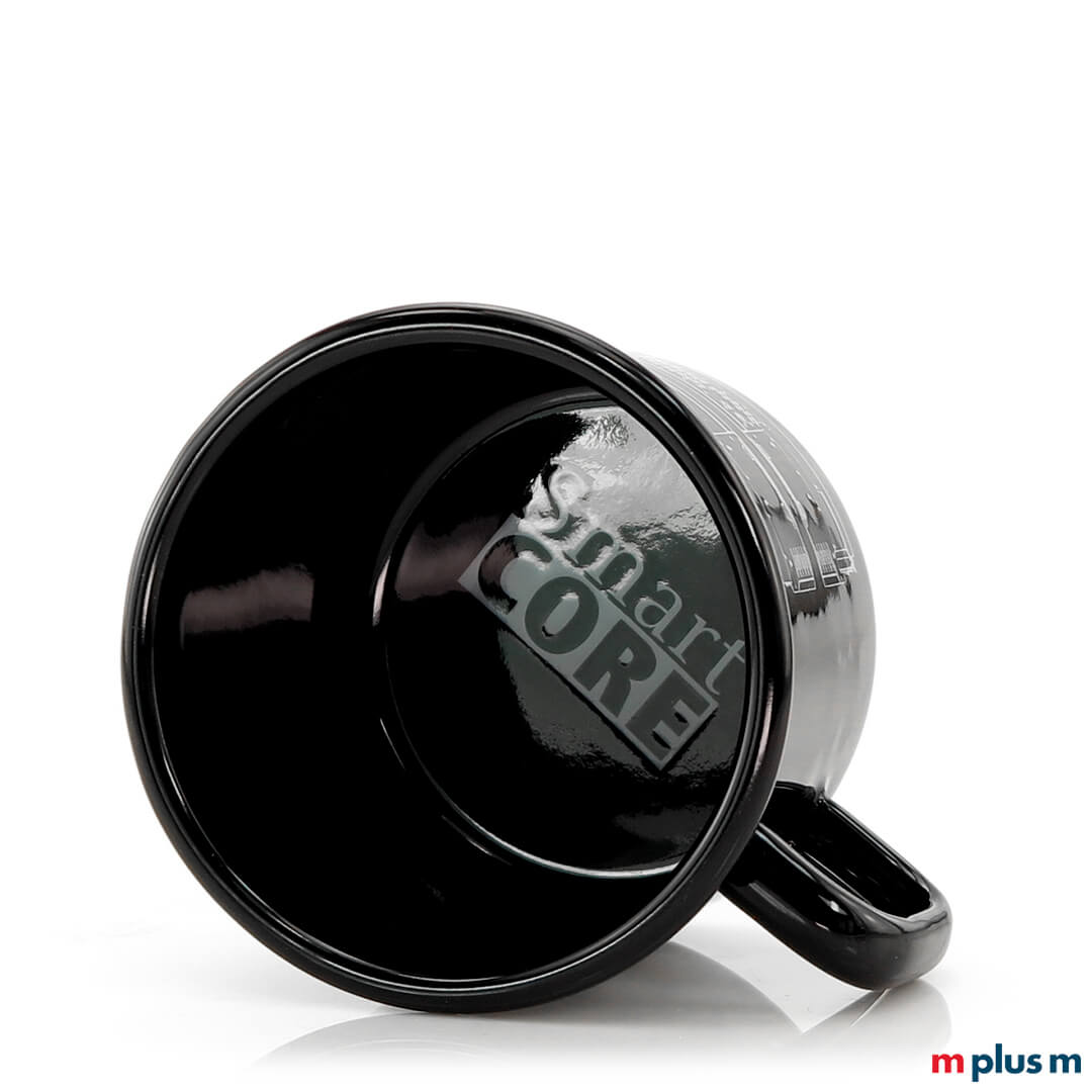 Emaille Tasse in klassischem schwarz: Setzen Sie die Kaffeetasse als langlebigen Werbeartikel mit Logo Druck ein.